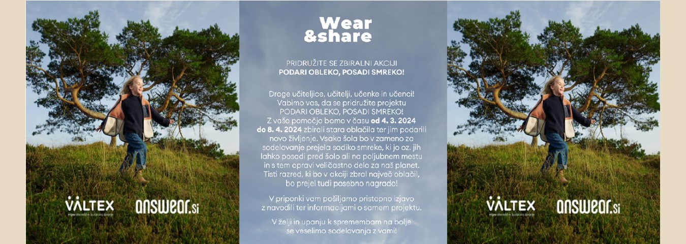 V Mednarodnem projektu Wear&Share, ki ga organizira podjetje Answear, so v Sloveniji zapartnerja izbrali podjetje VALTEX, ki pomaga partnerjem pri prehodu na uporabo resnično trajnostnih izdelkov na področju objektne higiene. Answear in VALTEX sta skupaj oblikovala projekt PODARI OBLEKO, POSADI SMREKO! in ga predstavila slovenskim osnovnim šolam. Sodelujoče osnovne šole bodo zbirale lepo ohranjena oblačila, katera bodo ponovno uporabljena v slabše razvitih državah, reciklirana ali uporabljena v drugih industrijah (npr za proizvodnjo zvočno izolacijskih materialov v avtomobilski industriji). Zbiralna akcija bo potekala med 4.3.2024 in 8.4.2024, z zaključno prireditvijo na Dan Zemlje, 22.4.2024, kjer bodo podelili praktične nagrade najboljšemu razredu.